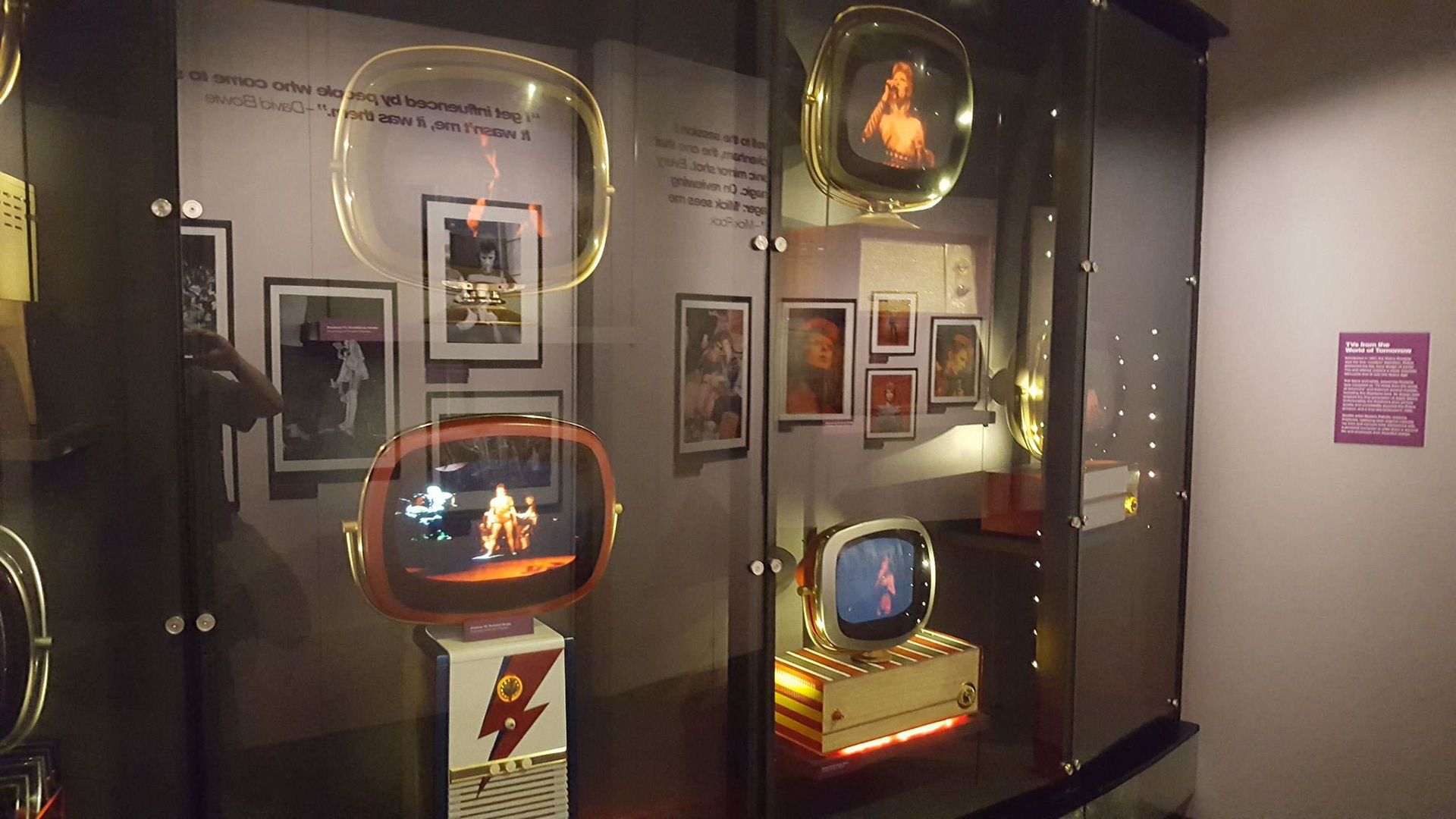 SOUNDSCAPE EXECUTION: Hall of Ziggy Exit Gallery: We said goodbye to exhibit visitors with The Transformers, a Glam inspired mashup video we created to capture the spirit of the downtown Manhattan ecosystem Bowie encountered when his Ziggy Stardust persona “fell to earth” in 1972. At that time, Lou Reed and his creative catalyst Andy Warhol were transforming popular culture from the inside out. The creative and cultural energy of this downtown alliance was explosive—film, dance, theatre, and fashion collided with music, fueling the rapid rise of Glam, Glitter, Punk, and Disco, and ushering in iconic bands like Mott the Hoople, T. Rex, New York Dolls, Kiss, and Alice Cooper. For this video, we integrated period tracks by Mott the Hoople and Lou Reed with a reimagined Ziggy Stardust track "Hang On To Yourself." Ten (10) Hidden Playback Speakers arrayed in floor, ear level and ceiling.